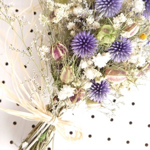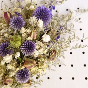 ブルーのルリタマアザミとブラウンのフーセンポピーを基調として、ホワイトのドライフラワーをアクセントにしたスワッグ。