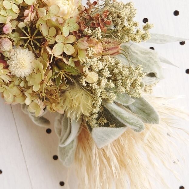 パンパスグラス、ピラミッドアジサイ、センニチコウ、ユーカリ、ヘリクリサム、ラムズイヤー