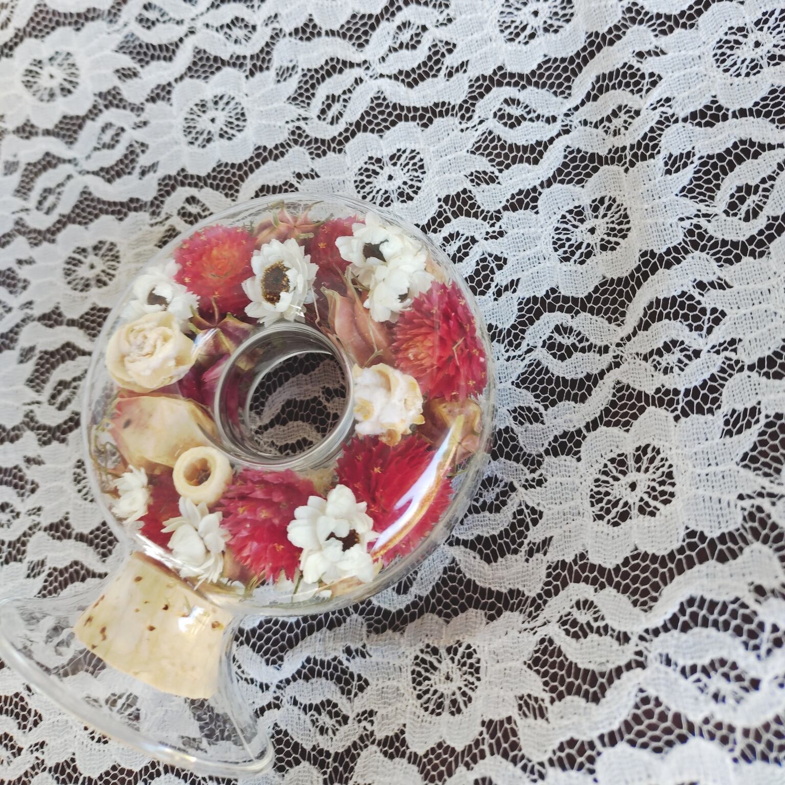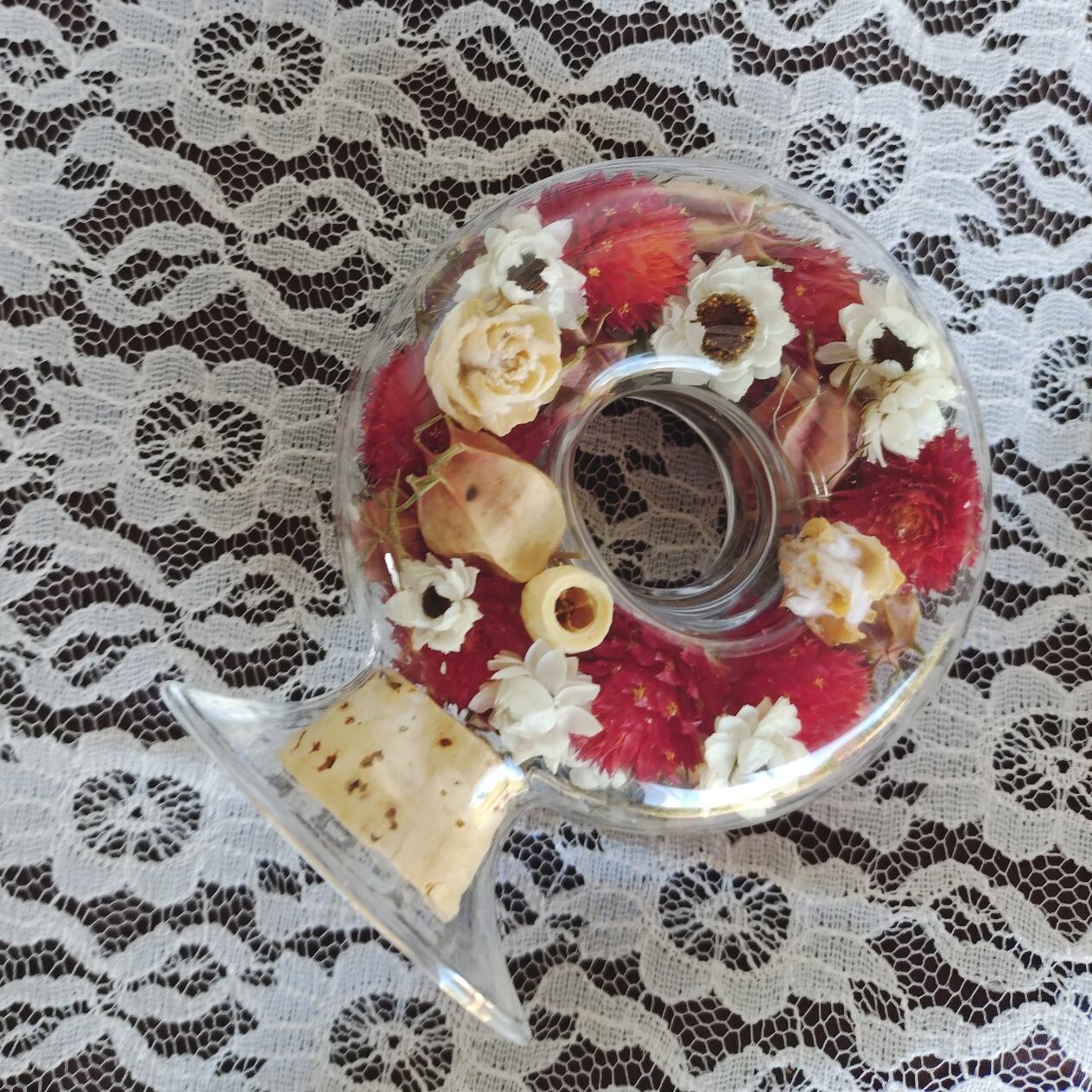 ドーナツのような形のガラスの中に可憐なドライフラワーを閉じ込めた、上品でナチュラルなインテリアアイテム。