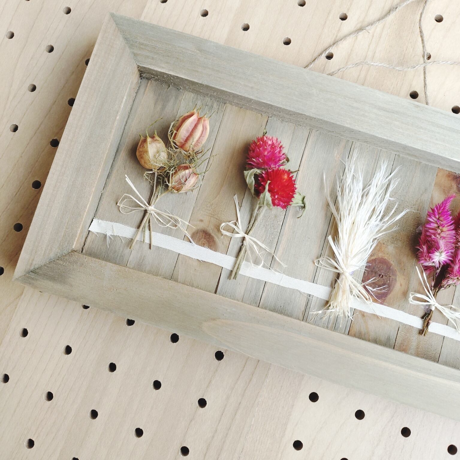 秋カラーのドライフラワーの小さなブーケの木製フレームアレンジ。