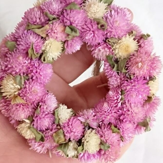 1年通して人気の手のひらサイズのセンニチコウミニリース。すべて畑で栽培したものを使用しております。