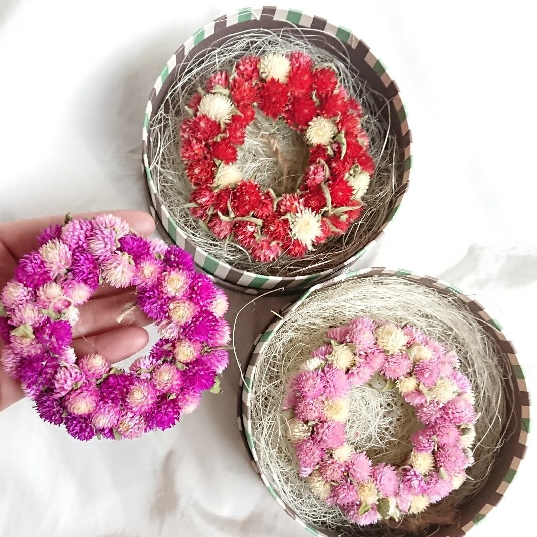 手のひらサイズのセンニチコウ紅白ミニリース。センニチコウはすべて畑で栽培したものを使用しております。