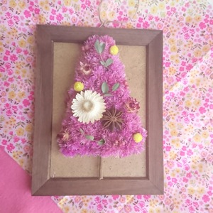 センニチコウ(ファイヤーワークス)をたくさん使用しましたフレームツリー。フレームを使用しているので、卓上用、壁掛けの二通りの飾り方ができますまたピンクのツリーなので、クリスマスが過ぎてもアートとして楽しむことができます。