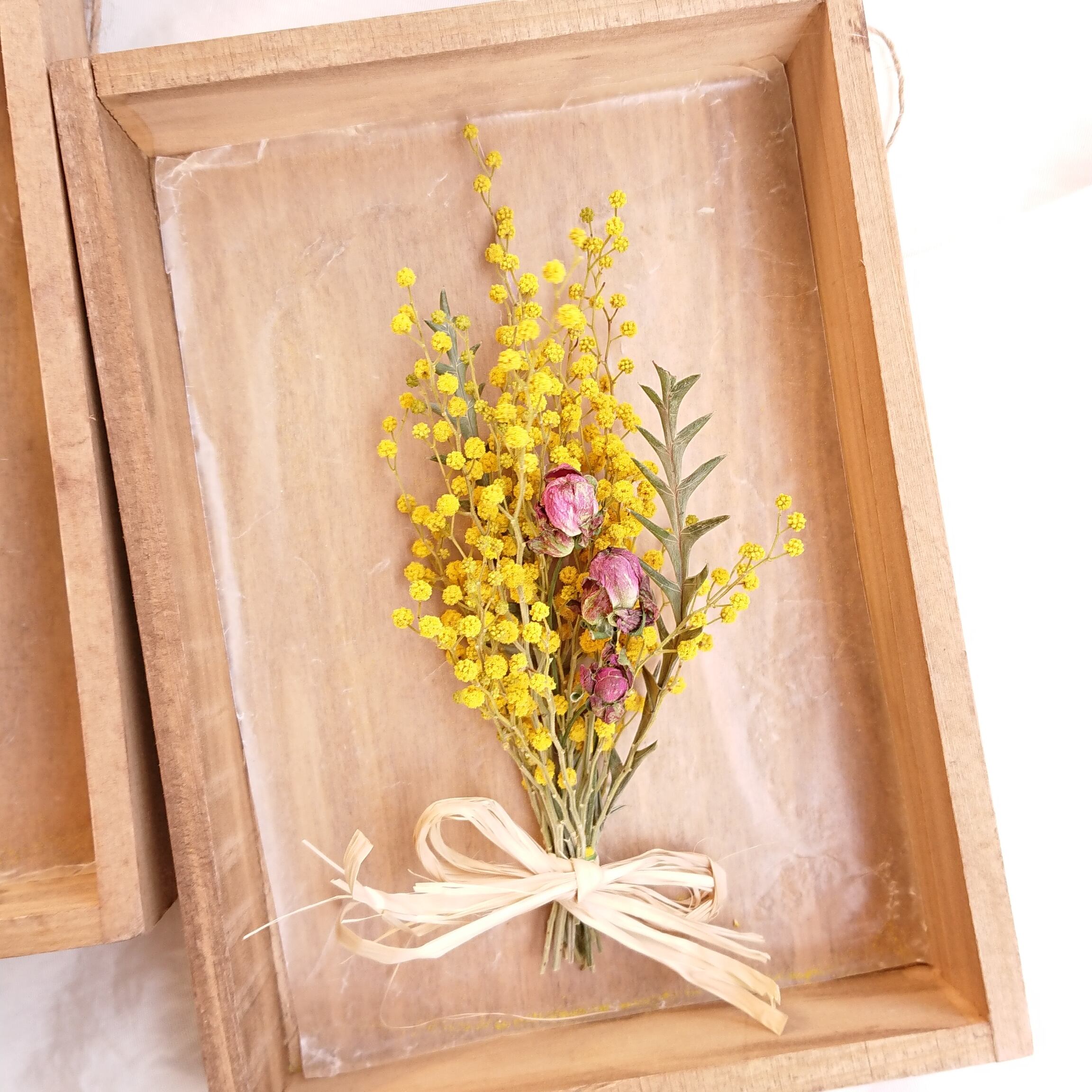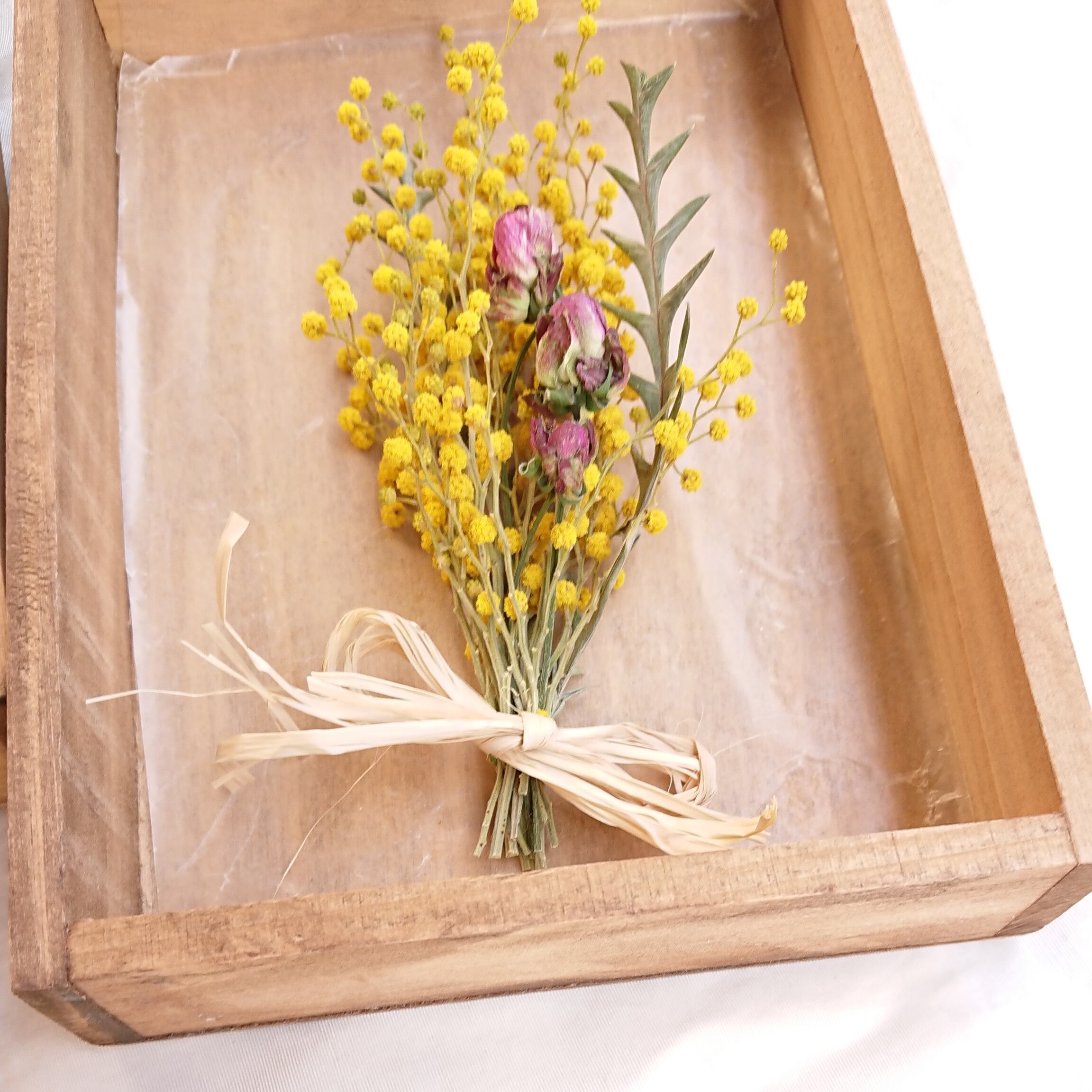 ミモザとスプレーローズ(ラディッシュ)のミニブーケボックスアレンジ。裏に壁にかけられるように金具とあさひもがついております。