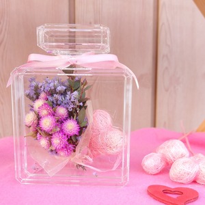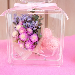 小さなバイカラーのセンニチコウと紫のハイブリッドスターチスのミニブーケとハートピックのプルフーモアレンジ。中に小さなミニブーケとハートのピックを詰め込んたアレンジになっており、バレンタインなどのプチギフトにオススメのアレンジです。また色合いも優しい色合いになっており、季節問わずに飾れる、場所を取らない管理しやすいアレンジで容器はプラスチック製になっております。