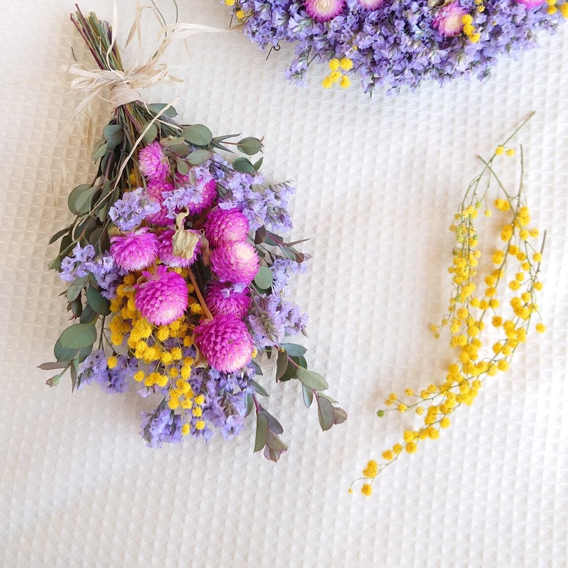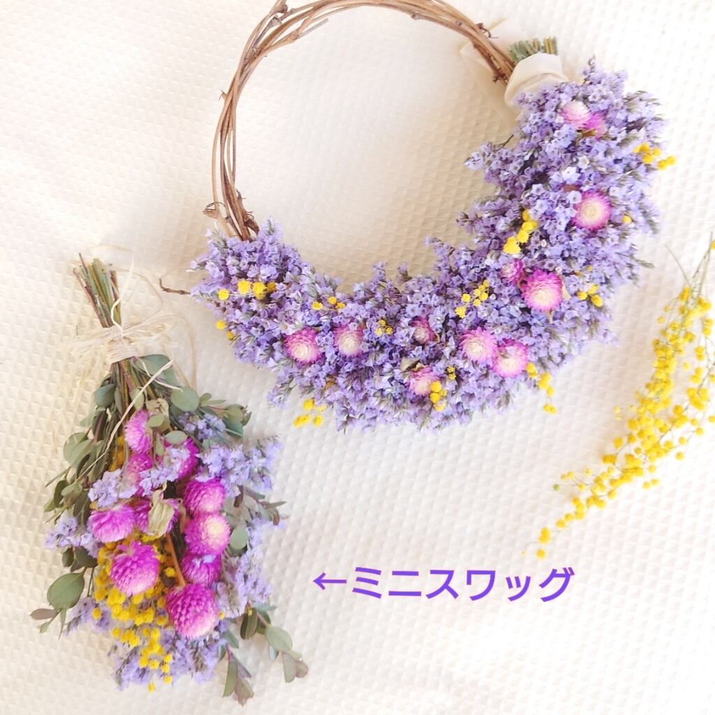 ミモザとセンニチコウとハイブリッドスターチスの春色ミニスワッグ。