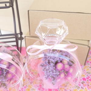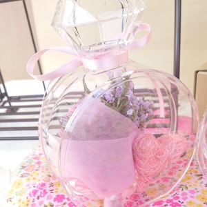 ホワイトデー、誕生日、母の日などのギフトにオススメの優しい色合いのボトルアレンジになっております。ボトルは香水瓶のような形でプラスチック製になっているため、落下しても割れにくいボトルアレンジです。