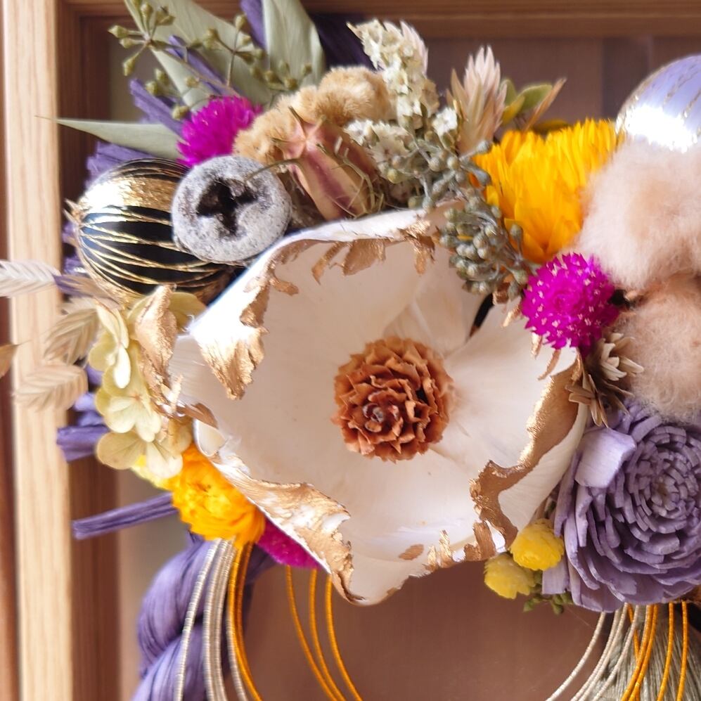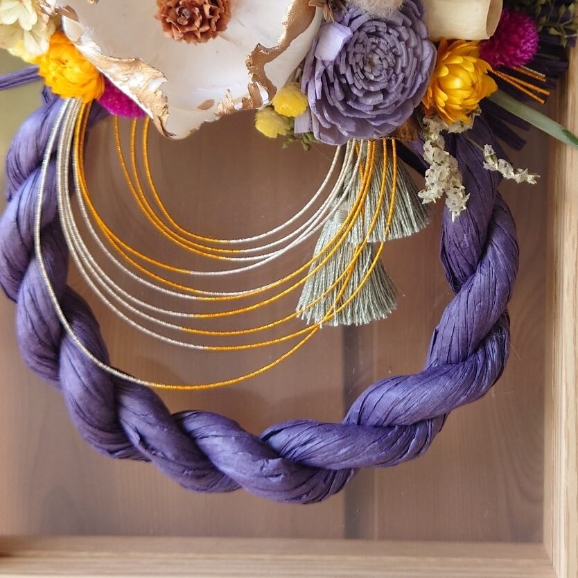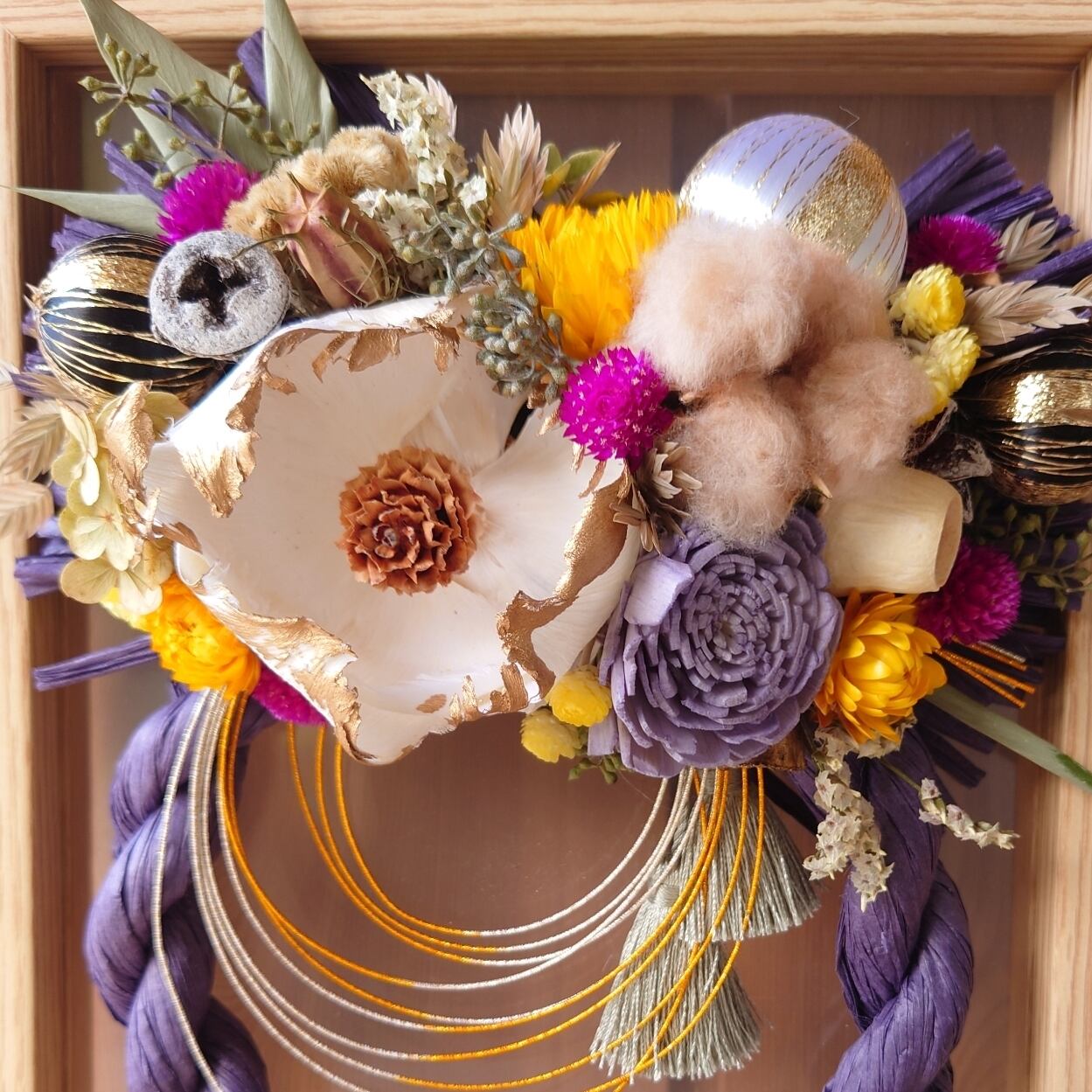 パームフラワーとコットン、ヘリクリサムのパープルのしめ縄。